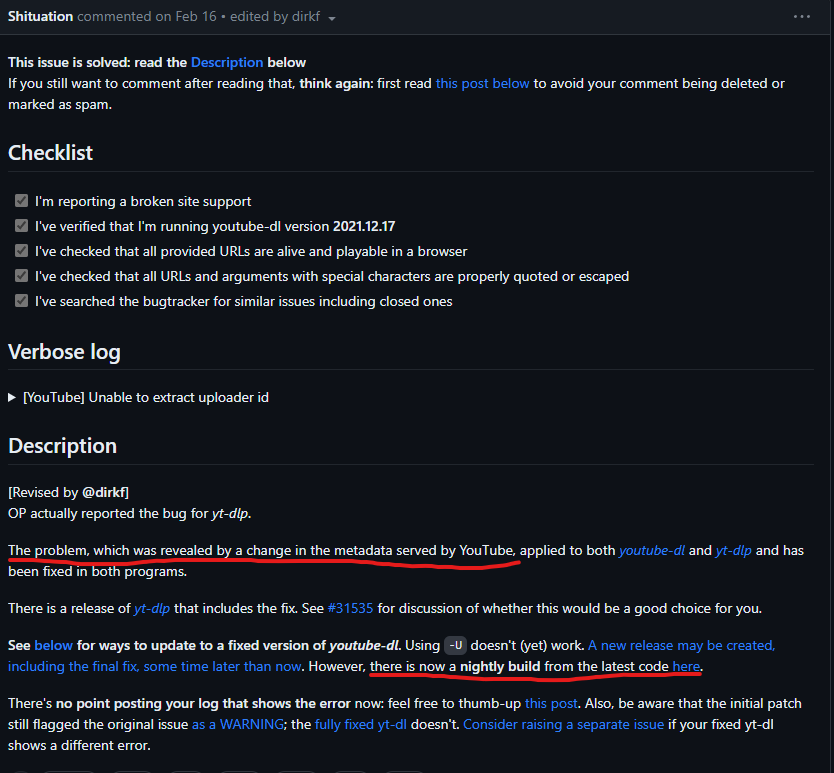 github issue 로 등록되어 있는 내용으로는 youtube 메타데이터가 변경되었는데 apt에 등록된 파일은 이전 버전이라서 다운로드가 안되는 것이다.