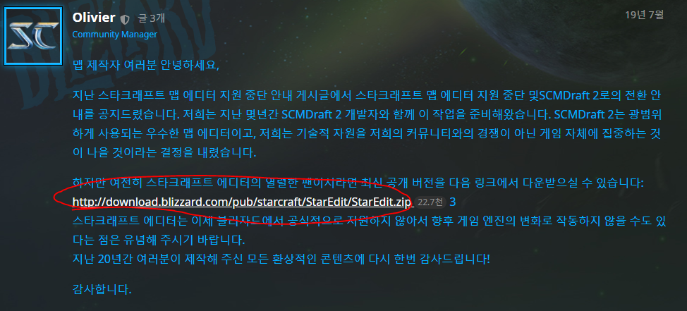 맵 제작자 여러분 안녕하세요, 지난 스타크래프트 맵 에디터 지원 중단 안내 게시글에서 스타크래프트 맵 에디터 지원 중단 및SCMDraft 2로의 전환 안내를 공지드렸습니다. 저희는 지난 몇년간 SCMD